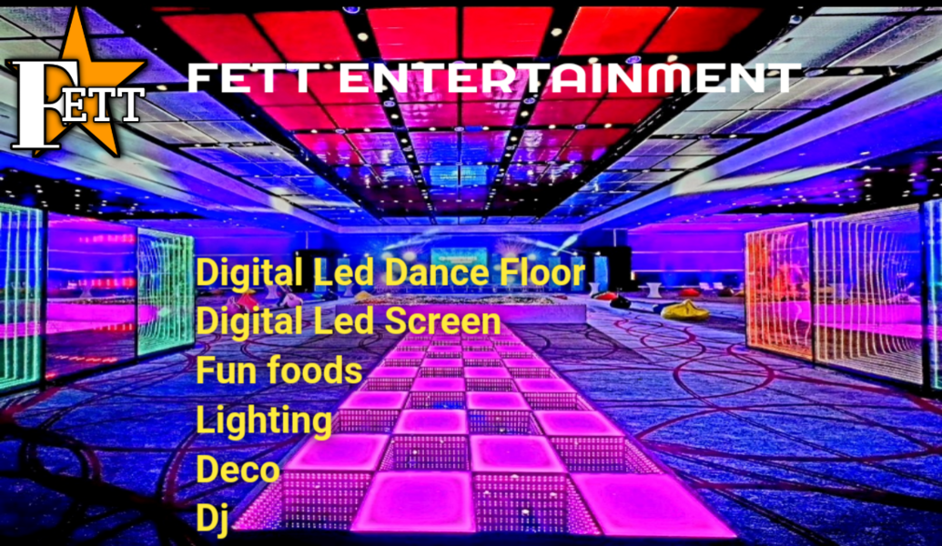 FETT ENTERTAINMENT has all it takes, one of the best DJs, a Customised Digital LED Dance Floor, LED Video Screen, Transformation Lighting/Disco lights Decor, Magic Mirror and the right machines such as Slush puppies, Popcorn, Candy Floss, Chocolate Fountain, Dj equipment, Tracks, and vibe to make sure everyone has a great time.